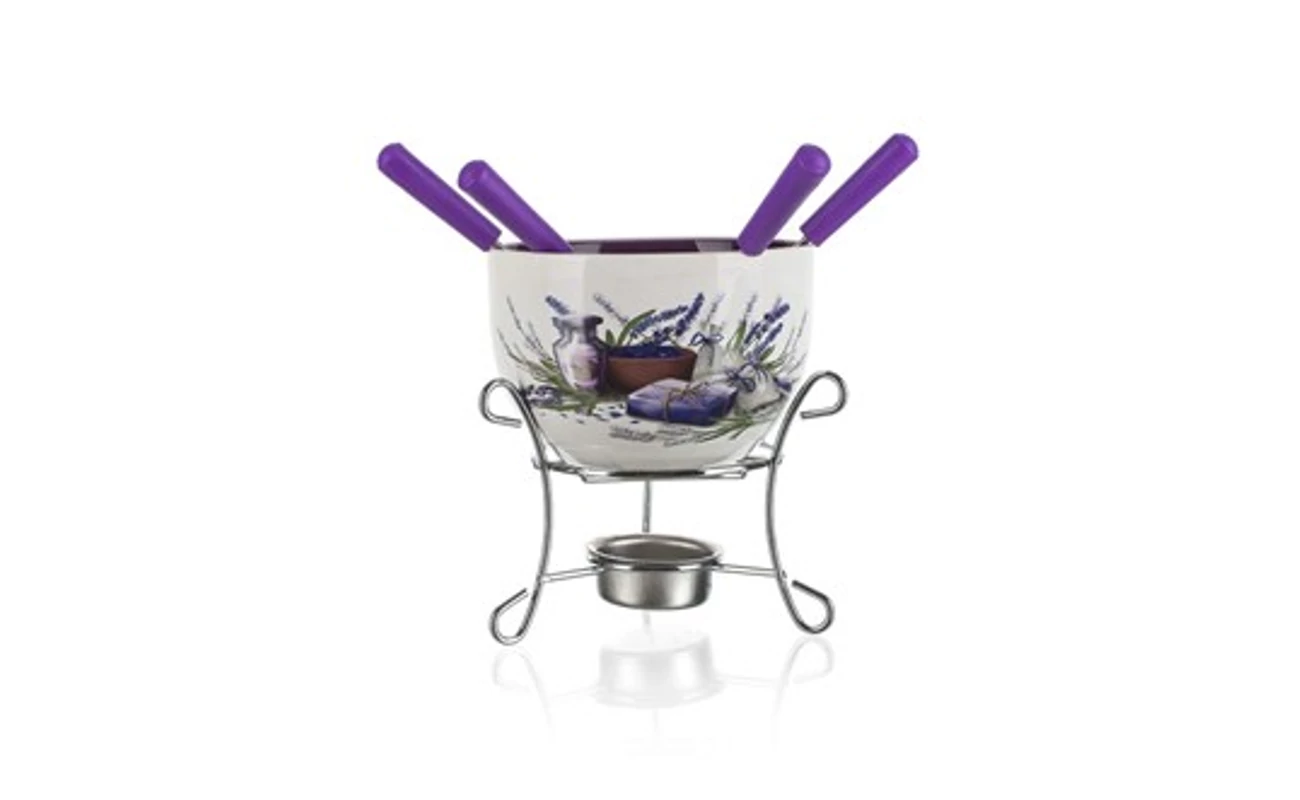 A szett tartalma:1db 11,5 cm átmérőjű, 7,5 cm magas kerámia tál, 1db krómacél állvány mécsestartóval, 4 db 15 cm-es fondue villa.