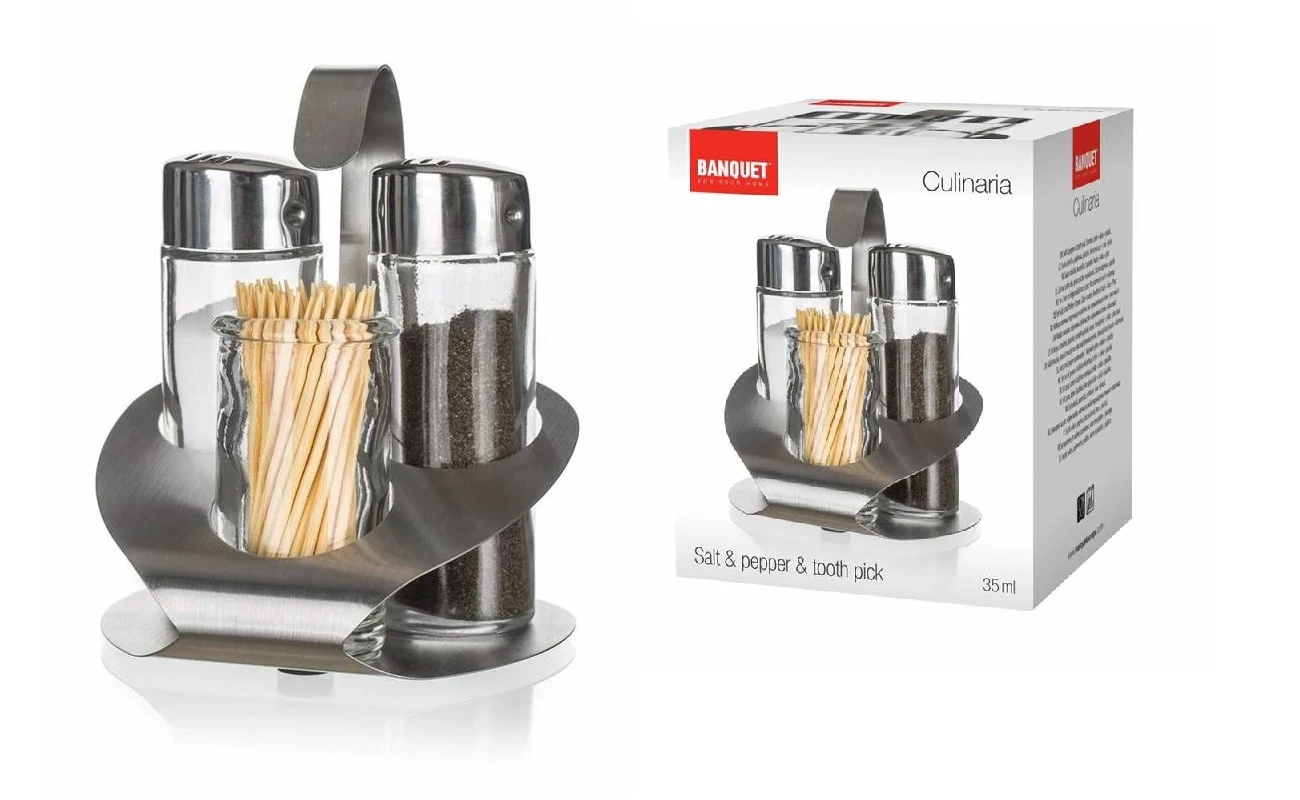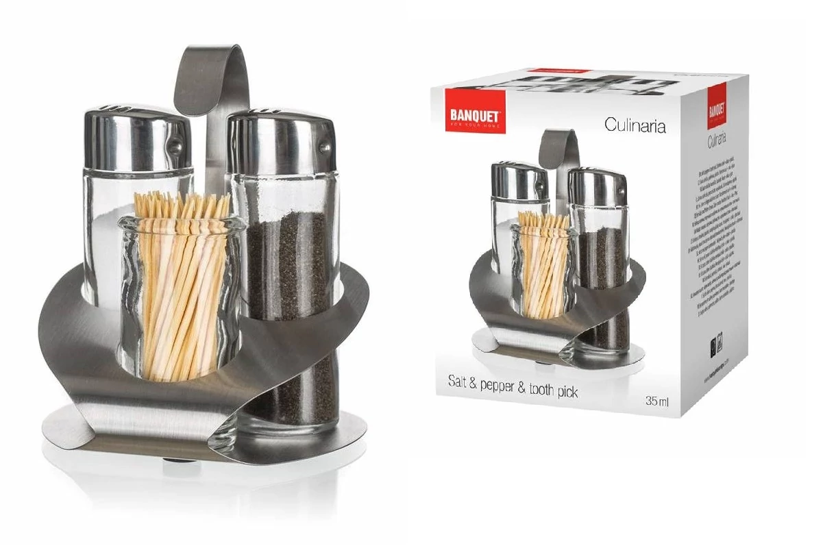 Leírás: Banquet Culinaria Só-Borsszóró szett fogvájó tartóval Fűszertartók mérete: 35 ml