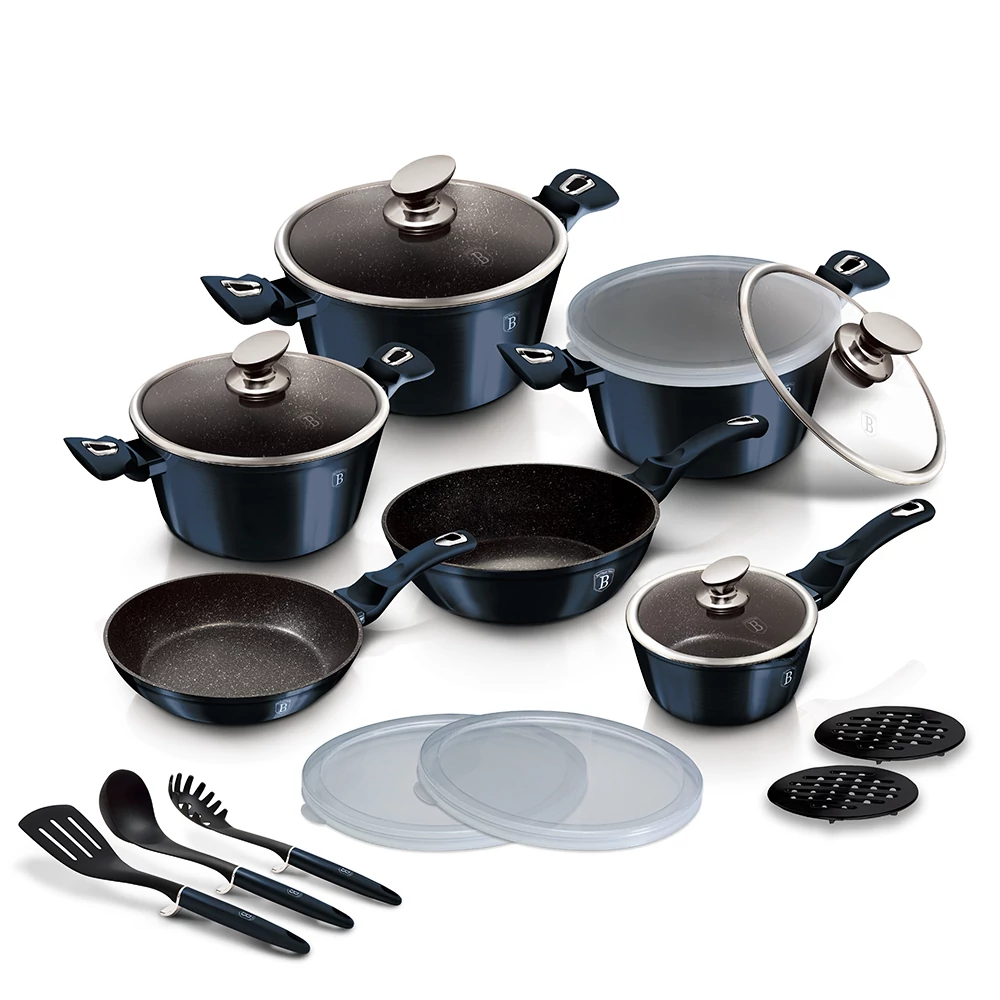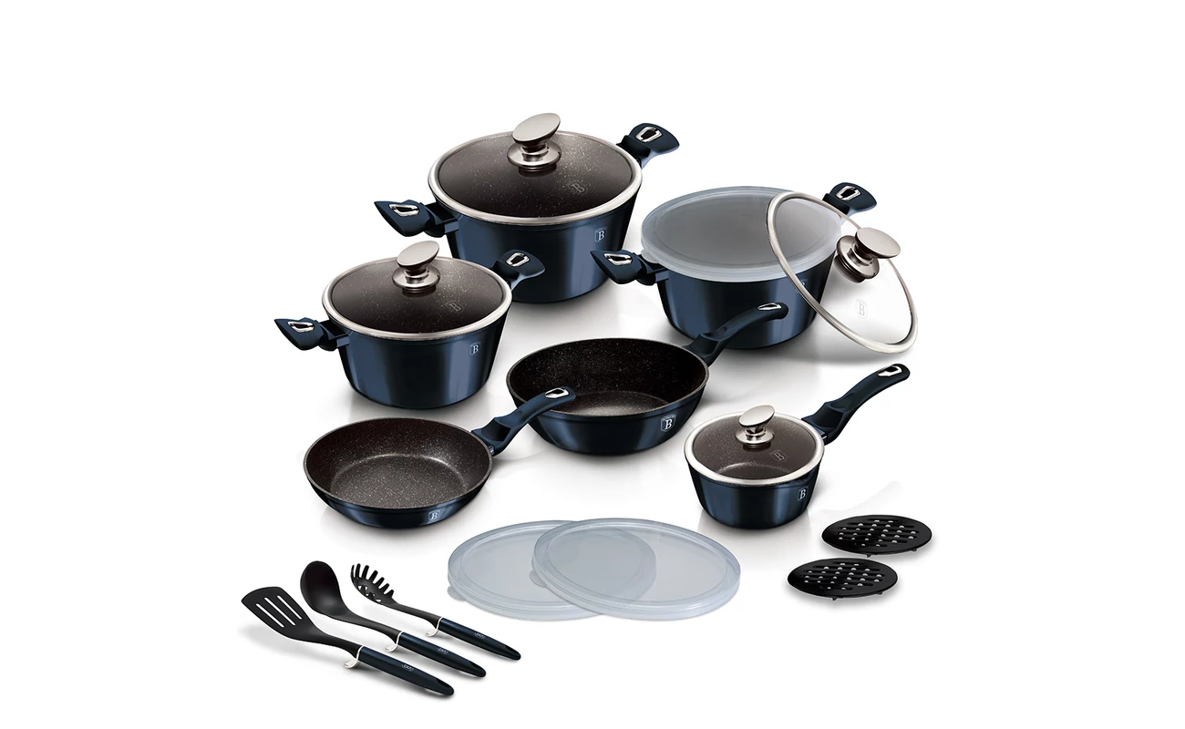 A Berlinger Haus Aquamarine 18 darabos edénykészlet a profi háziasszonyok kedvence. A készlet prémium minőségű, háromrétegű márvány bevonattal rendelkezik, amely megakadályozza az ételek leégését, még minimális zsírfelhasználás mellett is. Hőálló üvegfedőkkel van ellátva a főzéshez, valamint műanyag fedőkkel az ételek könnyebb tárolásához. Az edények vastag oldalfala és alja kiváló hővezető képességű kovácsolt alumíniumból készül. Megfelelő használat esetén, a világszínvonalú Berlinger Haus Aquamarine 18 darabos edénykészlet hosszú éveken át hű társ lesz a konyhában, és örömteli élményeket nyújt a sütés-főzés során!