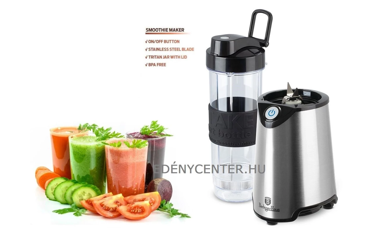 Berlinger Haus Black Silver Turmix, Smoothie készítő 2 az 1 ben. A mixer palackja ellenálló, BPA mentes tritánból készült. A szett tartozéka egy jól záródó szilikon tömítésű kupak, amely segítségével bárhová magaddal vihetted a kedvenc italodat. Ajánljuk az egészséges életmód kedvelőinek.