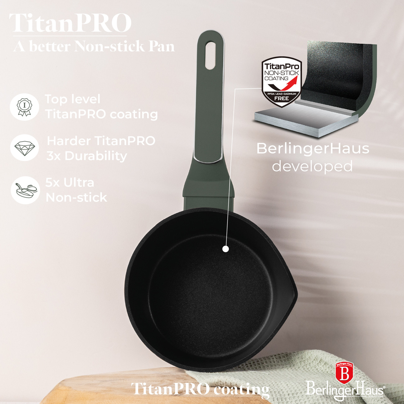 Berlinger Haus Matte Green Tejforraló / Szószos lábas extra ellenálló, tapadásmentes TitanPro bevonattal.