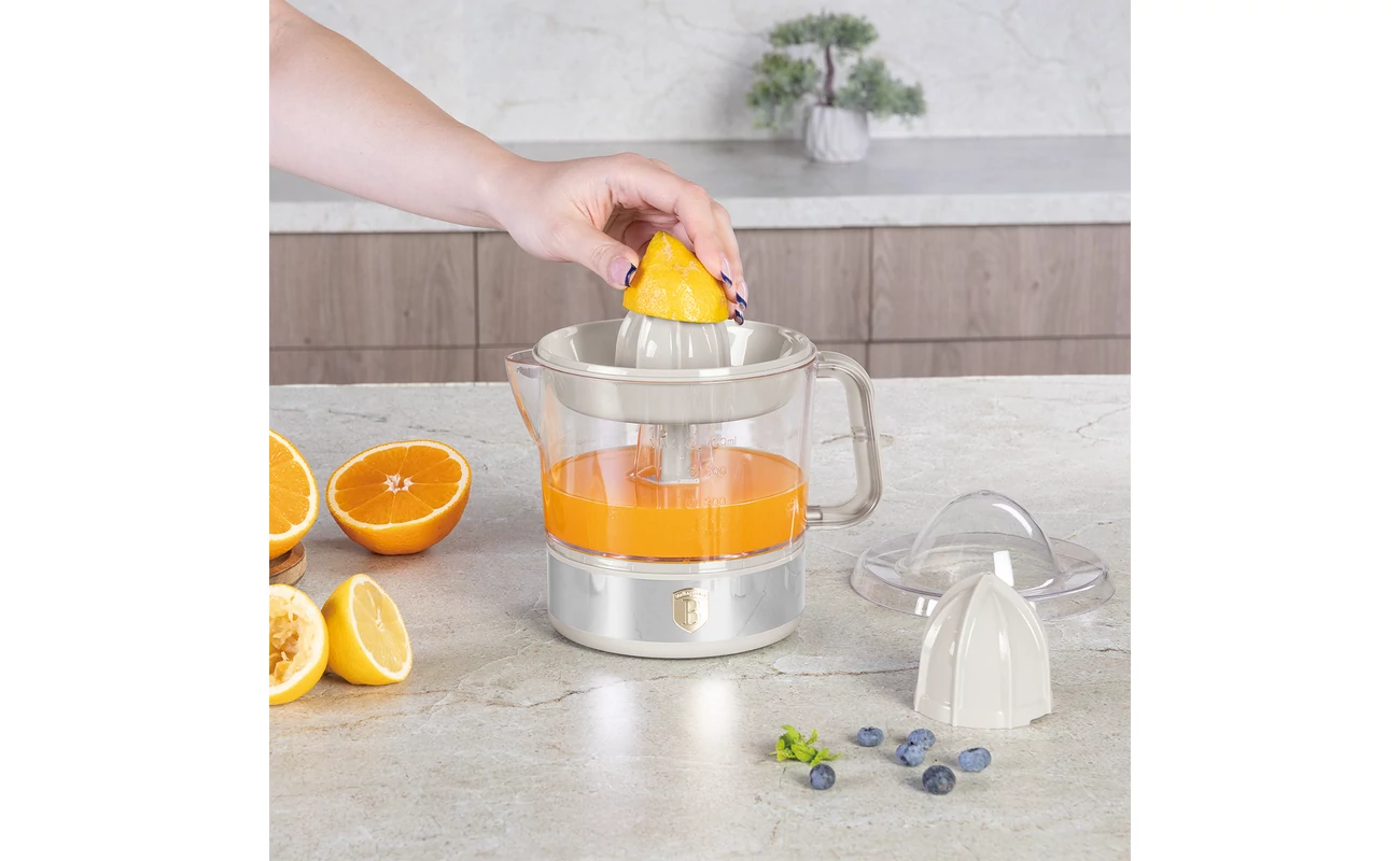 A Berlinger Haus elektromos facsaró két különböző méretű préselő tartozékkal rendelkezik, amelyek lehetővé teszik a különböző citrusfélék egyszerű és hatékony préselését. A kisebb préselő tartozék a lime és citrom préseléséhez ideális, míg a nagyobb tartozék a narancs és grapefruit préseléséhez ajánlott.