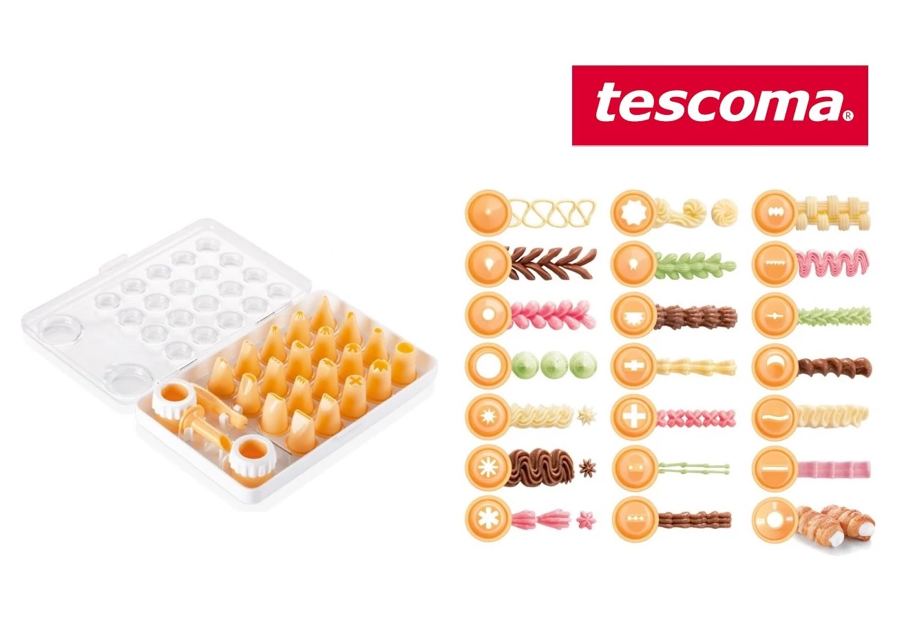 A készlet 20 darab díszítőfejet, 1 töltőfejet, tisztító kefét és 2 adaptert tartalmaz. A fejek számokkal