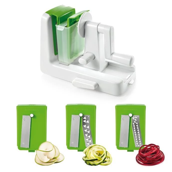 A Tescoma Handy spirálvágóval zöldségekből, gyümölcsökből percek alatt mutatós, vitaminokban és ásványi anyagokban gazdag ételeket varázsolhatunk asztalunkra. A kalóriadús, szénhidrátban gazdag tésztákat helyettesíthetjük cukkini spagettivel, zöldségtésztával. A spirálvágóval isteni salátákat, zöldségcsíkokat, pirított zöldségeket, valamint spirálszeleteket készíthetünk. Illesszük kedvenc gyümölcsünket vagy zöldségünket a spirálvágóba, forgassuk el, a többit pedig elvégzi helyettünk a 3 különböző, extra éles penge.