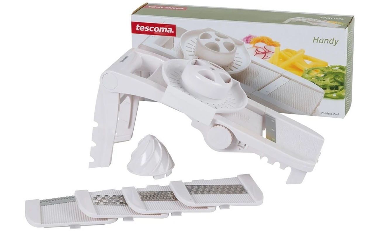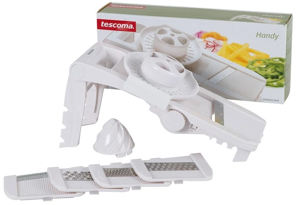 A Tescoma Handy többfunkciós szeletelő - reszelő kiváló minőségű rozsdamentes acélból, és csúszásgátló szilikon betéttel